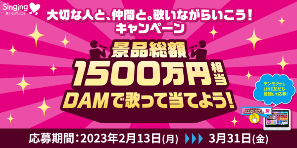 大切な人と、仲間と。歌いながらいこう! キャンペーン開催中 2023.02.14 2023年2月13日(月曜日)から3月31日(金曜日)まで 「大切な人と、仲間と。歌いながらいこう!」キャンペーンが開催中です。DAMの部屋を利用し 1,800円(税込)以上のレシートでご応募出来ます。詳細は当HP関連リンク DAM ボタンから!