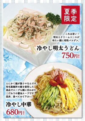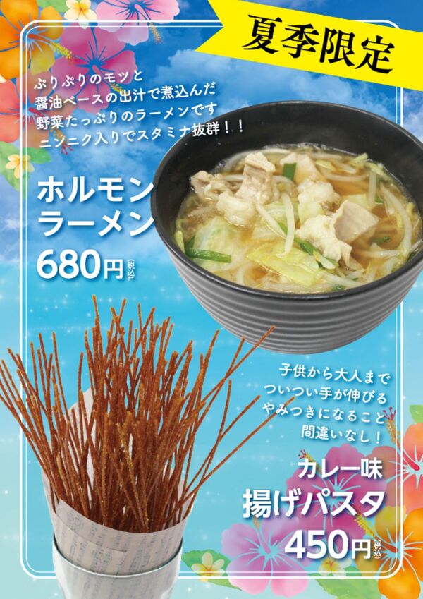 期間限定 夏メニュー販売について 2024.07.30 2024年8月2日(金曜日)から 期間限定 夏メニューの販売を開始致します。今回は「揚げパスタ」「ホルモンらーめん」「冷やし明太うどん」と昨年好評でした「冷やし中華」の4品です。ご来店の際は是非ご賞味下さい。スタッフ一同、皆様のご来店心よりお待ち申し上げます。
