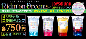 hololive 7th fes. コラボドリンク販売のお知らせ 2026.03.13 2025年4月3日(金曜日)から6月14日(日曜日)までの期間 holive 7th fes. Ridin'on Dreams × JOYSOUD コラボドリンクを販売致します。1杯 ¥750-(税込)で4種類ご用意しております。 今回も1杯につき1枚のオリジナルコースターをプレゼント致します。皆様のご来店、心よりお待ち申し上げます。